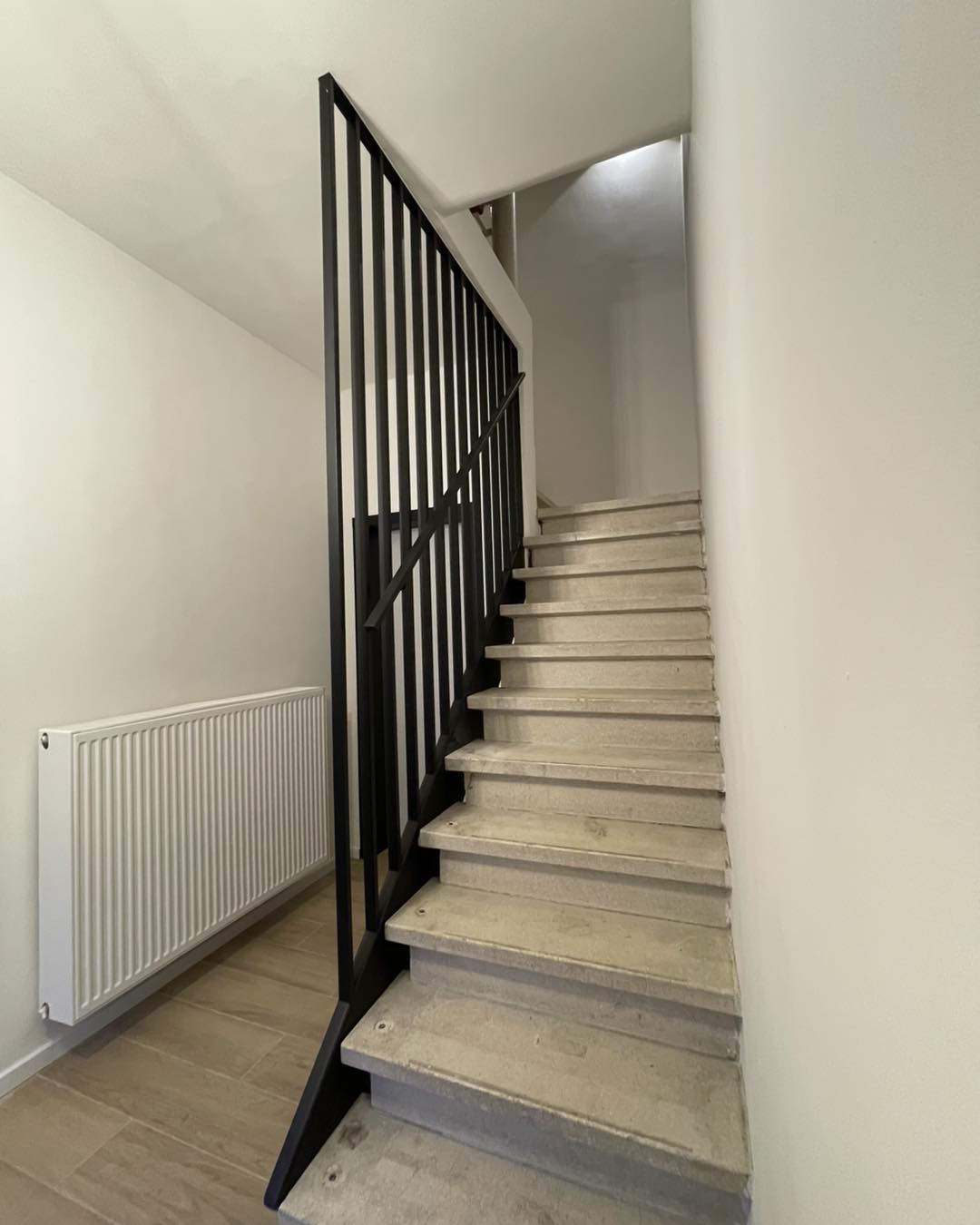 Een prachtige metalen trapleuning met slanke verticale stijlen en een elegante handgreep — sterk, veilig en stijlvol. Een perfecte combinatie van functionaliteit en design.