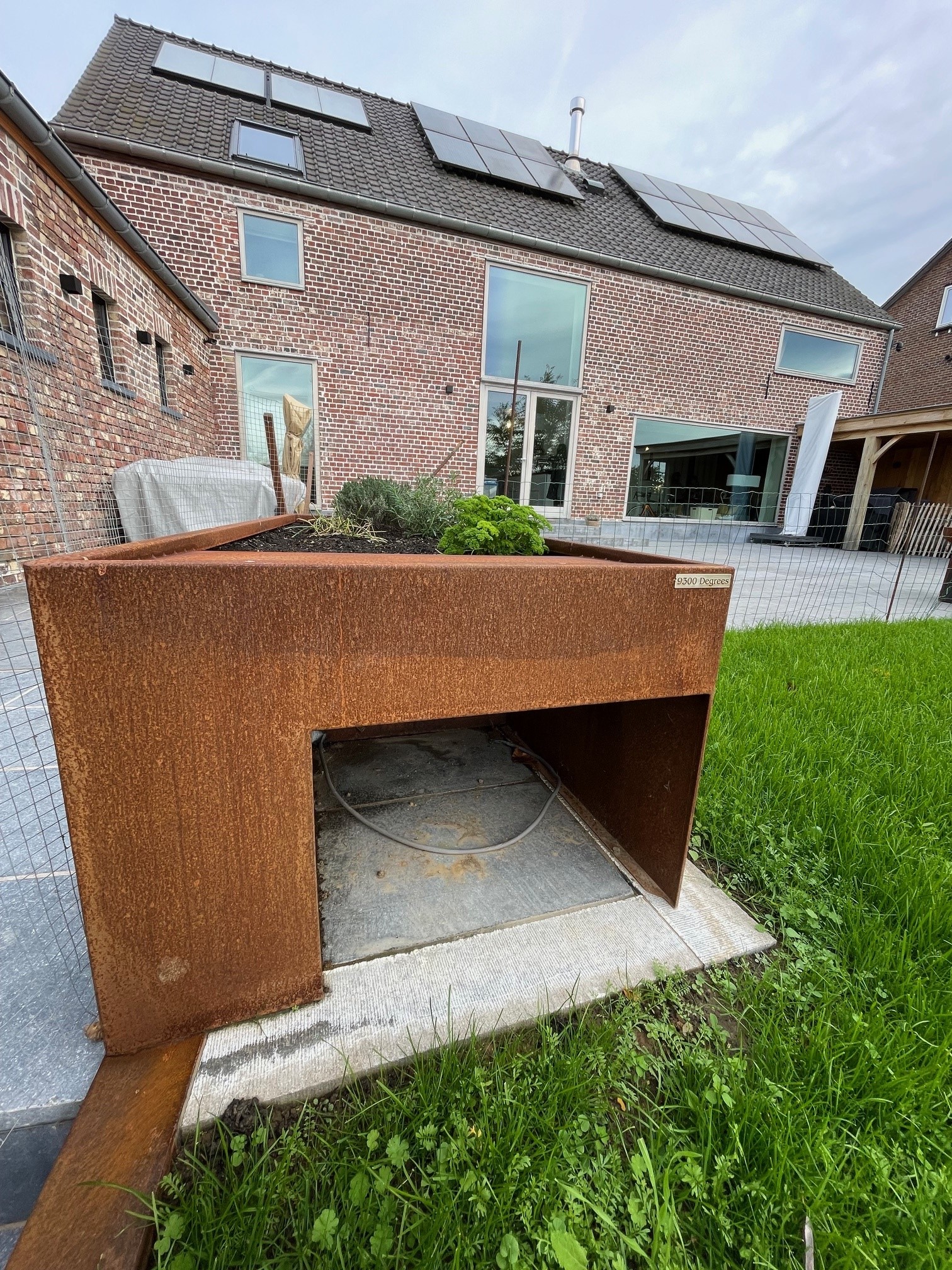 Deze cortenstalen plantenbak heeft een ingebouwde garage voor de robotmaaier, waardoor je zowel je planten stijlvol kunt presenteren als je robotmaaier veilig kunt opbergen. Een praktische en moderne oplossing voor je tuin.